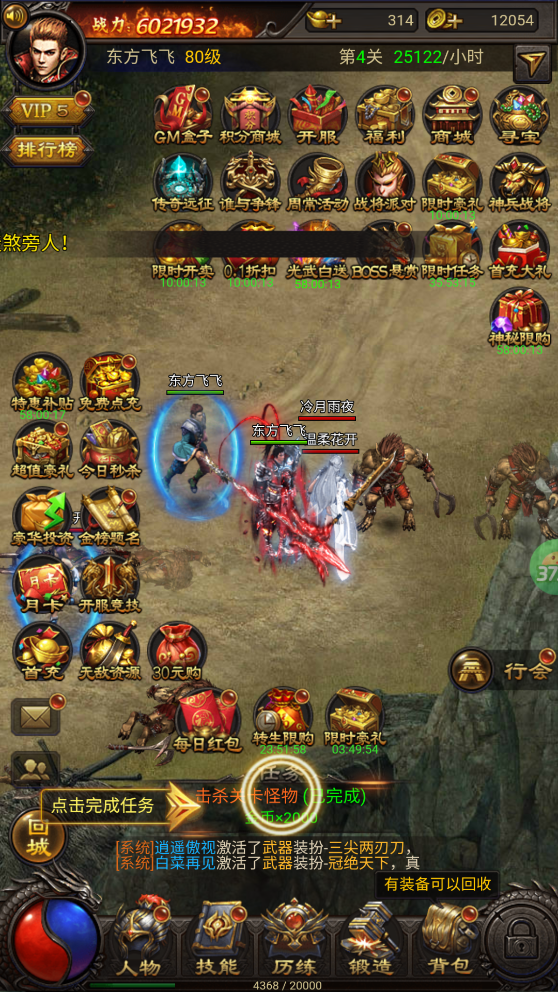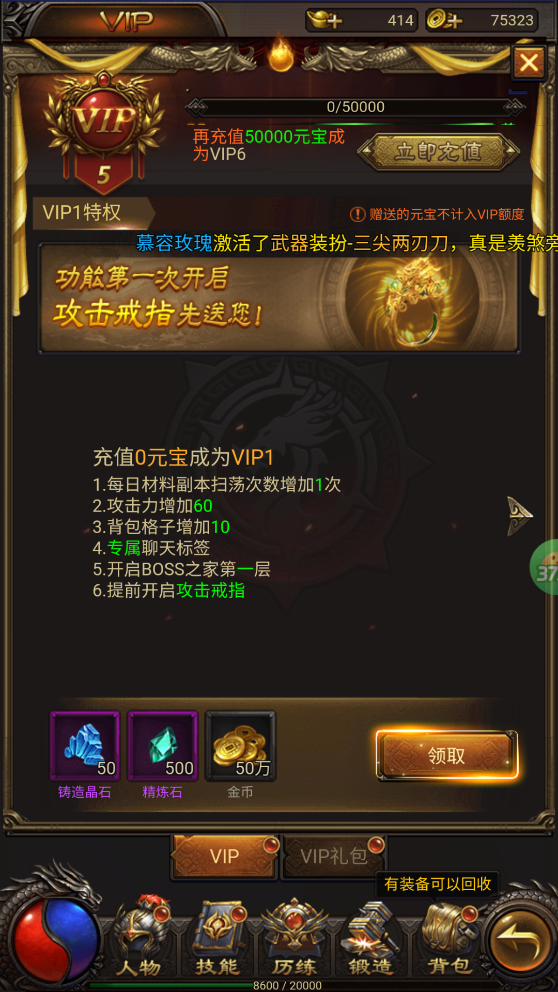 不需要的装备可以进行一键回收,回收还可以获得大量元宝