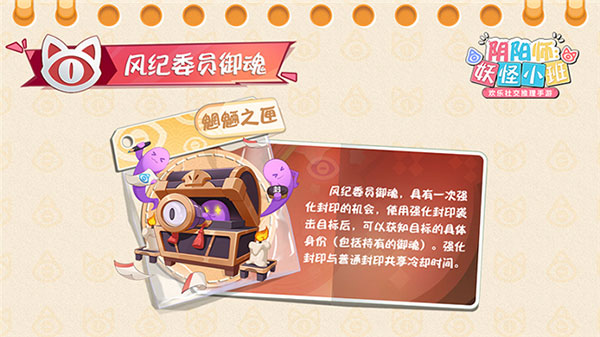 持有“魍魉之匣”御魂的风纪委员,具有一次强化封印的机会,使用强化封印袭击目标后可以获知目标的具体身份,甚至持有什么御魂也是一目了然,这么强大的“透视能力”惊不惊喜、意不意外?不过强化封印与普通封印共享冷却时间(敲黑板)!但一旦把握好这次机会,嘿嘿,家长大人们细品~