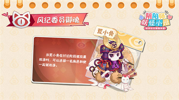 效果上看,“荒小骨”御魂与“狰”御魂两者之间有异曲同工之妙,持有“荒小骨”御魂的风纪委员,同样能在被放逐时,选择一名角色和自己一起被放逐~不想当“阿飘”,且瑟瑟发抖的小话痨默默缩小身形,小声默念“看不见我、看不见我”……
