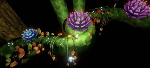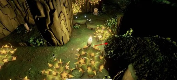 第四章第一节,点击屏幕右边燃烧蜡烛的同时点亮小蘑菇,跟随小蘑菇发光的线路,这里躲着个小蜡烛哦