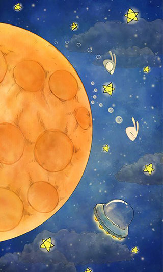 游戏的操作很简单,游戏中两只兔子会自动绕着月亮旋转,其中一只兔子由我们来控制,我们只要通过点击屏幕让兔子跳跃的高度降低下来从而达到控制它的跳跃速度,让它与另外一个兔子相遇,两只兔子相遇就能增加生命值,在生命消失前完成环绕月球圈数尽可能的达到最多就可以了;