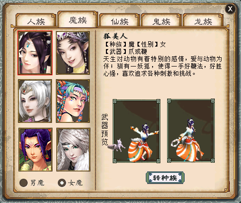毕竟大话有5个种族:人、魔、仙、鬼、龙,所以选择种族得了解他们的特性: