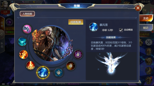 5、暴风雪:召唤暴风雪,对目标范围3个怪物、3个玩家造成400%伤害,减少玩家移动速度,持续5秒;