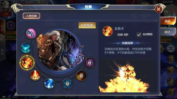 3、龙息术:召唤远古巨龙的火焰,对攻击前方范围9个怪物、4个玩家造成270%伤害;