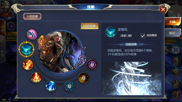 2、龙卷风:召唤龙卷风,对正前方范围6个怪物、3个玩家造成220%伤害;