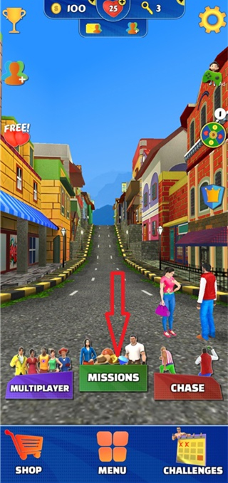 1、首先我们下载安装好街头追逐者,通过加速器打开这款游戏界面,点击MISSONS选项;