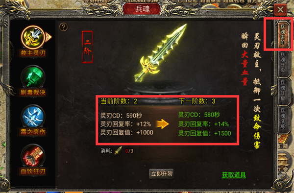 1、兵魂进阶分为:救主灵刃、剧毒裁决、霜之哀伤、血饮狂刀,这个可以增加我们的属性和伤害
