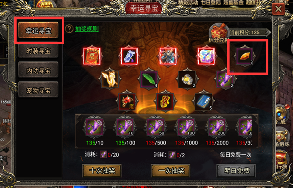 1、幸运寻宝里面可以抽奖获得玛法宝石