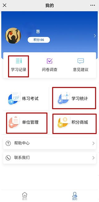 点击“我的”,用户名下方显示已得积分。“学习记录”可以查看已学课程和练习、考试记录。“学习统计”可以查看已学科目的进度、成绩、通过率、总时长等信息。“积分商城”功能正在开发中,所得积分可用于兑换礼品。