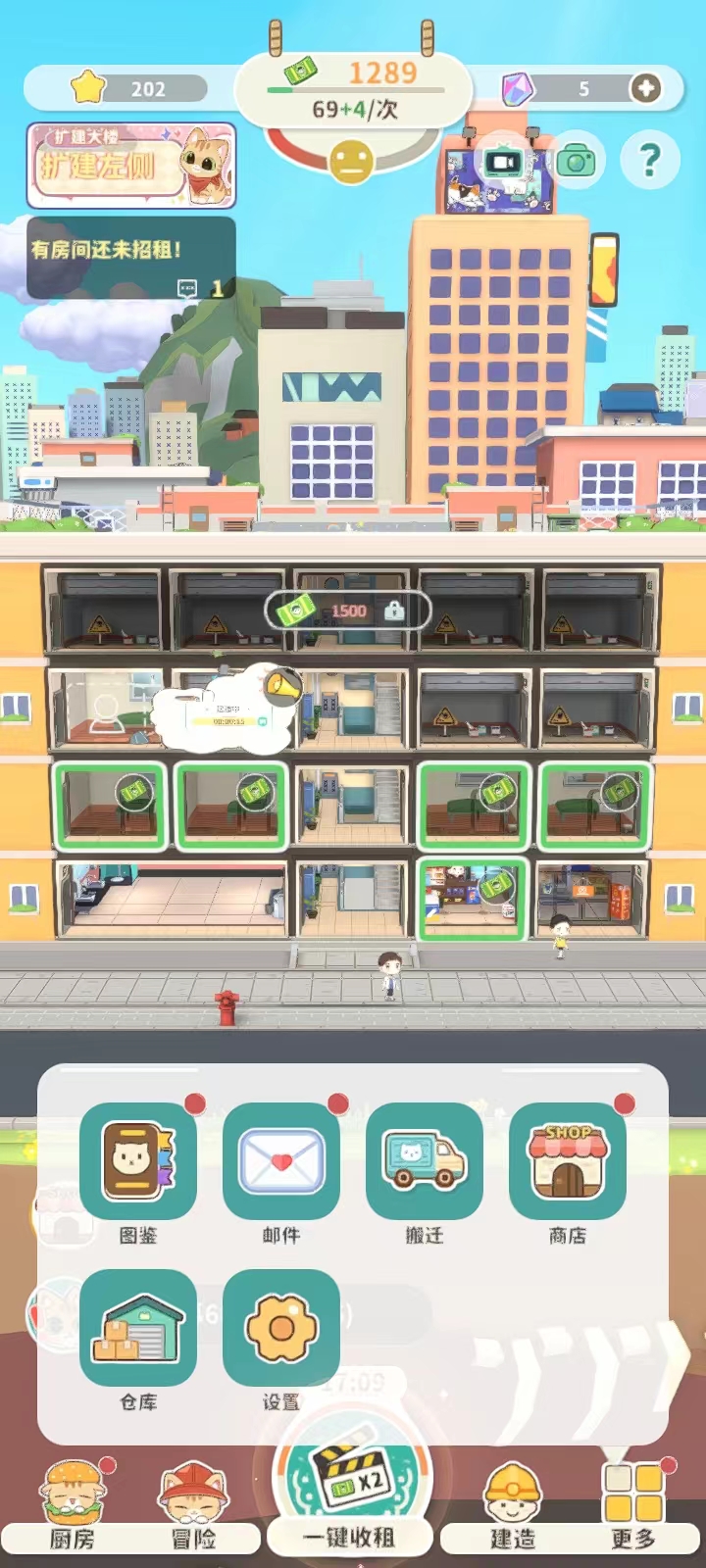 在游戏中,玩家是经营公寓的管理员,又是公寓租客们的知心大姐姐,不仅要建造单人公寓、男生公寓、女生公寓、标准公寓,甚至复式公寓等不同类型的公寓房间,还要建造餐厅、快递驿站、早餐铺、面包店等等商铺,满足租客们的需求,以便更好地服务于他们,从而提高租客满意度,获得更多的幸福能量,玩家也能收取到更高的租金。