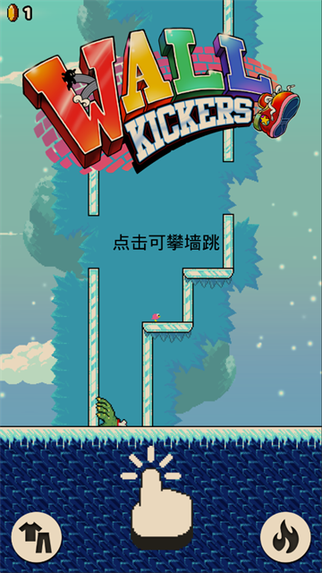 wall kickers是一款以贴墙跳为机制的动作闯关游戏,也可以译为“爬墙者”,而且相比忍龙等游戏而言,wall kickers操作较为简单,玩家仅需扮演一位攀爬者,通过点击屏幕即可控制角色跳跃,灵活的翻滚、跳跃来不断地进行突破,通过不断地向上攀岩来得到更高的游戏分数,躲避不同的陷阱以及飞鸟,避免被形形色色的陷阱困住攀爬的道路。