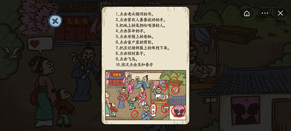 左下角地上的毛笔,左上角“玉春楼”点“玉”“春” 变“状元楼”,风车糖葫芦中间的书,中间的人,算命的卦,右上角的棺材,右下角的卷轴,右下角窗户点一下,飞鸟点一下变成飞书,杀猪牌匾上的布 拽右下角。