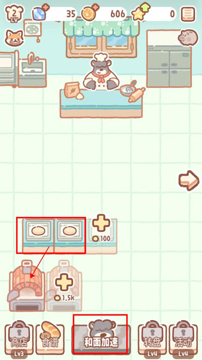 2、在厨房里,玩家可以连续点击下方的“和面加速”或者直接点击熊师傅即可加速制作糕点的速度,制作完成的糕点会出现在下方的格子里,需要拖动到下方的灶台才可以烹饪