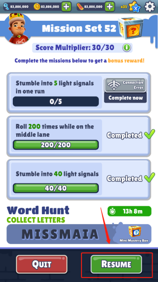 4、点击“resume”可以恢复游戏从暂停位置继续游戏