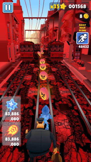 地铁跑酷愤怒金币版本是由地铁跑酷的忠实玩家是熊大不是大能魔改而成的一个版本,在这个版本中,游戏中的金币变成了愤怒的表情包图样,游戏地图也被愤怒的红色裹满,游戏角色的初始装扮也进行了改变,类似于“透明”jake。营造视觉上的冲击感,其他的地方保留了原汁原味的地铁跑酷,玩家只需求控制角色在地图中跑酷躲避障碍物以及警察的追捕,拾取尽量多的金币,跑出稍远的距离,以此获取高分数,制霸跑酷排行榜!游戏中可以解锁更多跑酷角色,及滑板样式皮肤,同时游戏中还配备了不同道具,大大的提升了游戏的可玩性。想要尝试地铁跑酷愤怒表情包版本的用户请认准当快软件园下载!期待您的精彩表现!