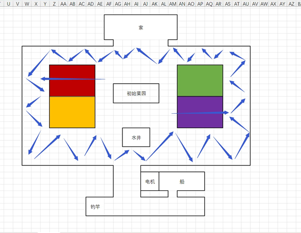 五个菜园只需要解锁两个,分别是红色和紫色,也就是最高级的和最高级的斜对角,目的有两个,一个是开路,方便夜里找小丑。有时候就是因为两步路的距离没有交互到小丑,就被蓝色小丑当面刀了。蓝色为大概找小丑的路线,对,就是走Z字形。