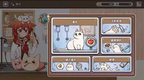 4、医院除了看诊,还有植入晶片(植入晶片后猫咪走失才有机会被寻获)、注射疫苗(一生中只需要打一次,不打可能会生重病)、虫类预防(远离跳蚤)和绝育(预防疾病+有效控制猫咪数量),跟现实生活中中的动物医院非常相似