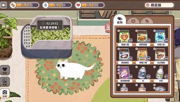 5、等待会猫咪后还能帮它们取名字,接着从左下角按饲养,点击进去后最上面可以看到猫咪的状态,看看你的猫饿不饿、渴不渴还有心情如何,依照猫咪的情况我们就可以将食物、道具或猫砂拖到猫的身上,但有时候喂食,主子还不一定会吃,毕竟每只猫的口味也是不一样的。