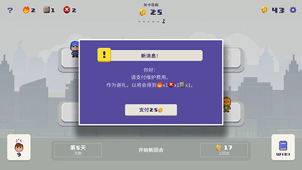 2、游戏中以天数为进度,消息提示我们需要在5天后支付25金币的维护费用,点击【了解】即可继续;