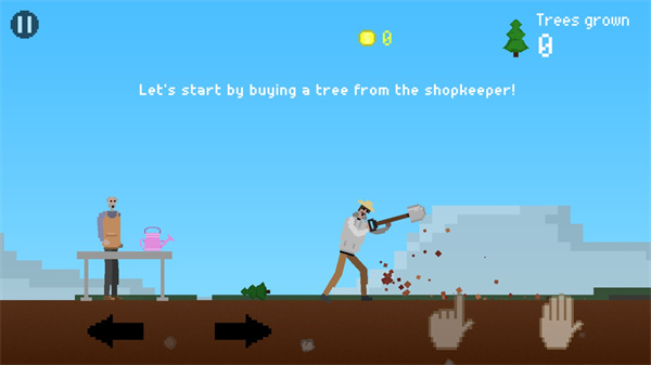 1、下载进入我要种树游戏,首先我们来到这个老头子和桌子旁边,点击左边的这个手按钮进入商店;