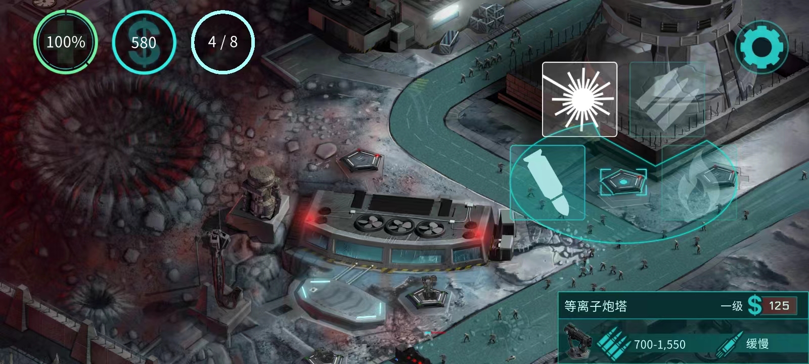 3、最后一关,建议基地一炮两枪一等离子,两个喷火左下和右上各一个,其余用等离子或者炮台,注意时机用技能,多摸索几次就过了