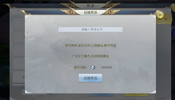在《九州行》中,一直跟着主线任务走,60级时会解锁帮派功能,创建帮派需要消耗5000000银两,取一个霸气的名字(您的帮派可不能和现有的帮派同名哦),点击创建即可;加入帮派则只需要在你喜欢的帮派后面点击申请,然后等待帮主批准,就可以进入了。