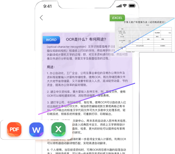 纸质文档一键转换 Word/Excel,轻松整理各类报表报告合同等。