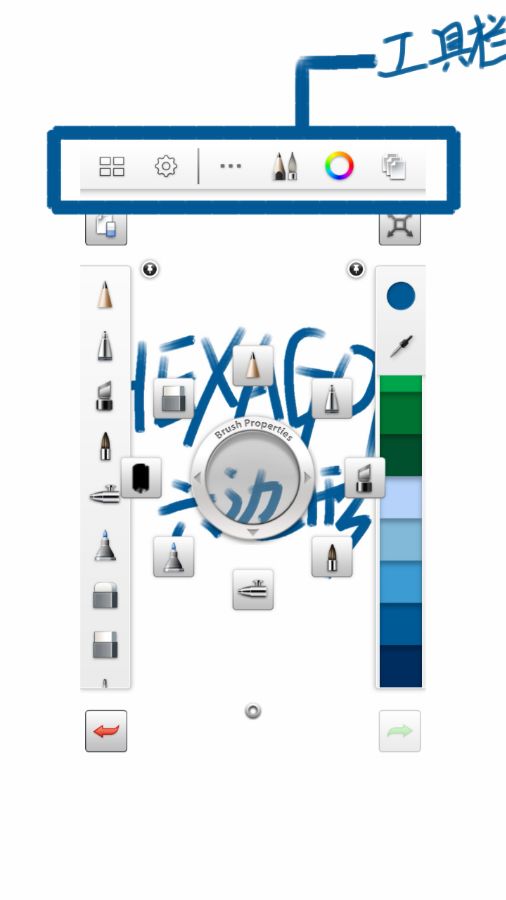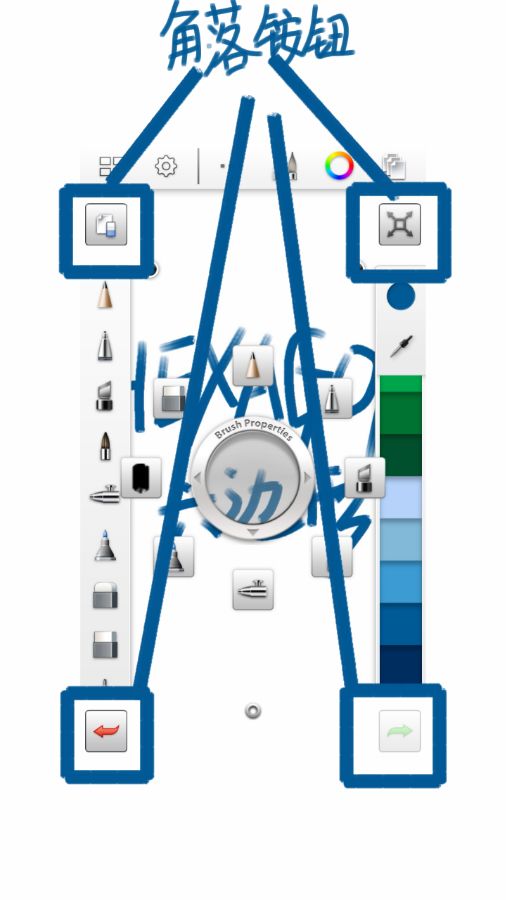 为了接下来的说明中表达清晰,我把软件分为了几个部分,分别是: 工具条,图层,环形菜单,选项板,角落按钮,画布。