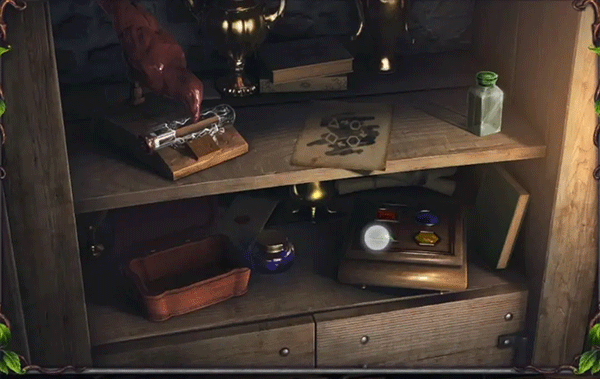 6、对右侧的马使用马鞍后打开口袋拿到火柴,来到塔楼楼上对左边书柜使用火把,然后使用火柴点燃火把能看到后面的图案,挪动书拼出如上图案后打开后面的柜子,小寻物游戏做一下,全部安装后按照提示按下三角形(左下)-圆形(右上)-六边形(右下)-菱形(左上)打开下面柜子拿到皮带。