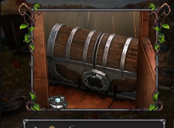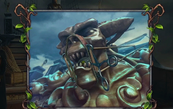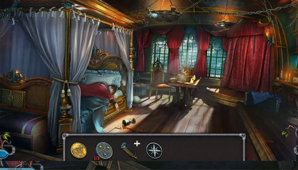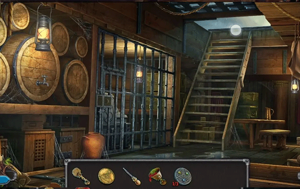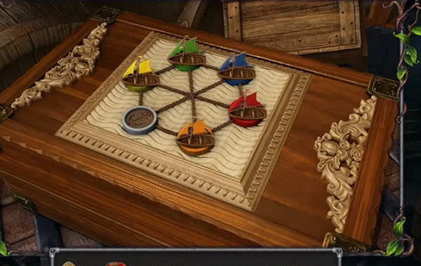 14、查看左下角女巫床头方格物品(箱子上面),使用六角星徽章后打开是个移动宝石小游戏,打开箱子获得肥皂,对女巫的手指使用肥皂获得戒指,到甲板对左边的渔网使用剪刀获得元素,对中间上面的怪头使用剪刀获得元素,这样元素就齐了,对右边船舷位置使用镊子获得硬币。