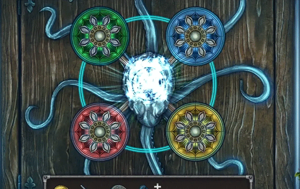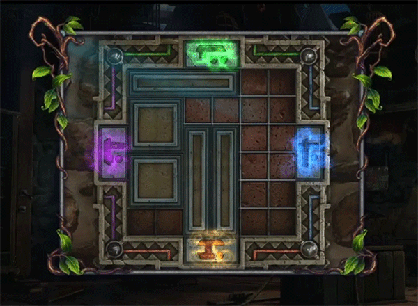 3、中间柱子上有一艘小船,点一下拿到小船和钉子,小船显示1/3,所以还需要两个,对中间的空挂钩使用宝石后光线被折射在了右边画像上,查看画像后使用铁钉玩小游戏,要将四个方块放在对应颜色上,最终是摆放位置如图,拿到雕像,后面还有手稿是重要的剧情道具。