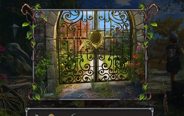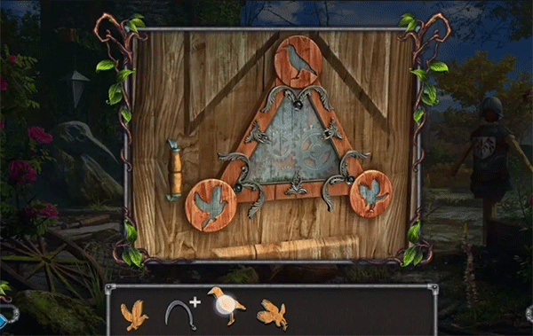 4、回到塔楼一层,对左边柜子使用铁钉拿到手柄和鸟雕像,先查看镰刀头再使用手柄就能组成完整镰刀了,上楼对鸟笼使用鸟雕像获得钥匙,在左边抽屉使用钥匙获得狮子门把手,来到塔外对右侧门使用镰刀后使用门把手开始解谜,这个需要拉动左边或者右边的门和中间的图案组成完整动物,组成后记得点击一下动物就能完成收集了,可以点击左下角这卷纸查看到底少哪个。