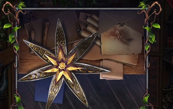 13、查看一下桌子有第4个手稿,对盒子使用标记(最左边那个黄色硬币)获得镊子和剪刀,拉开右边的红色帘子找星星,注意有个转星星的地方,只能看到左边部分,星星转好后如图,找完后获得魔法书,查看右边书柜使用魔法书拿到药水瓶,把墨水瓶放在桌子上。