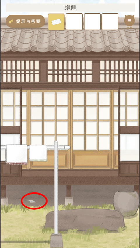 先来到门口场景,发现捕虫网和虫箱。大门外、侧缘、田地三个场景都有昆虫,比较隐蔽的是侧缘左下角的地缝里(没错还是那个纸条的位置)还有一只。都抓到了会有人物语言提示。现在去打开电视机柜下的昆虫锁吧。