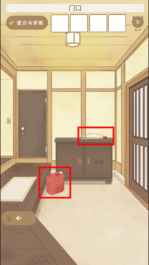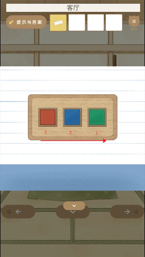 3、将两个【纸条】组合起来,获得线索:红红蓝蓝绿,(客厅)点击柜子,按从左到右的顺序按下按钮,红2次,蓝2次,绿1次
