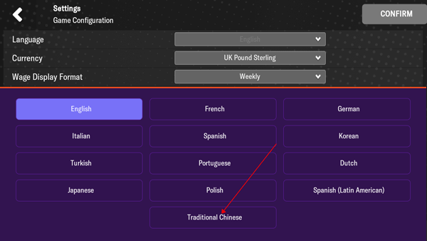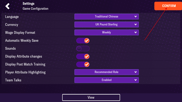 4、最后不要忘了点击右上角的CONFIRM保存设置,完成后游戏就切换为中文了。