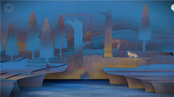 2、双击屏幕后向右边走,我们可以发现下方有河流过不去的。然后我们沿着屏幕的最下方进行滑动便可以拉出风铃,然后狼会趴下。(后面有狼的地方我们先要找到和一样的风铃)随后便会出现一座桥,我们从桥上走过去,来到下一个场景。