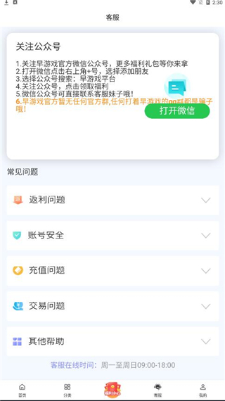 5、在客服功能中,玩家可以咨询返利问题、账号安全、充值问题、交易问题和其他帮助。