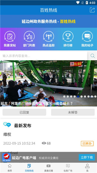 1、下载进入延边发布app,在首页中你可以随时看到各种热点新闻;