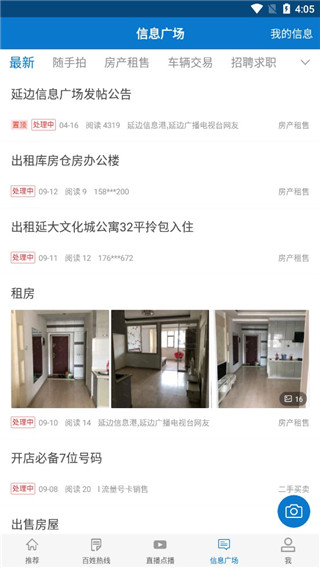 6、在信息广场页面,房屋租售、车辆交易、招聘求职等信息可随时了解;