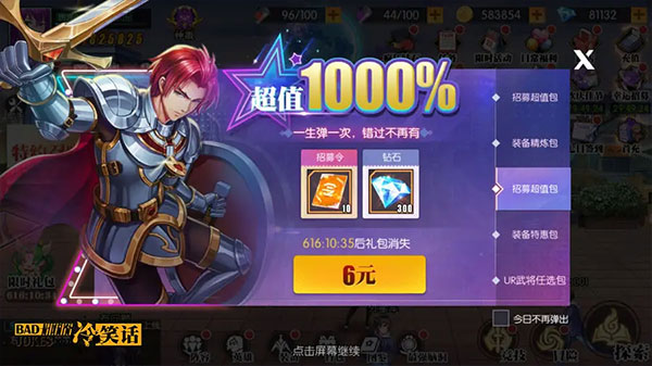 每天来个超划算的低价每日礼包,积少成多追赶大佬!每日1元和3元档分别有1个和3个体力药水,前期冲级必备;6元档每天2个招募令,配合触发每日6元连充,再多得1个体力药水以及2个SSR英雄碎片任选箱,累计第5天还能额外获得1把SSR武器,划算到飞起。