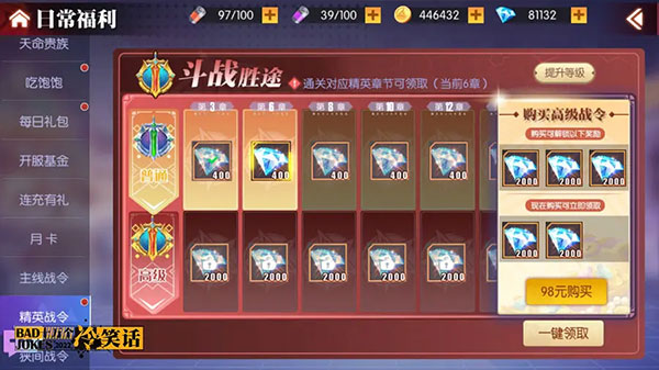 所谓精英,就是要快人一步!98元的精英战令,通关完22章累计获得免费的4000钻石+额外领取20000钻石,挑战关卡,证明自己,成就感和回报都相当丰厚。