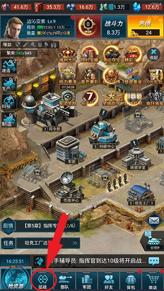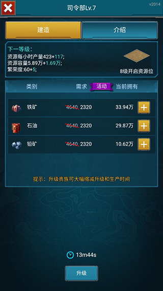玩家点击主页中间的司令部,可以进行司令部的升级,升级司令部可以解锁更多建筑。