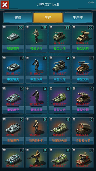 玩家点击屏幕左边蓝色生产图标,即可进入坦克工厂页面,可以生产坦克、步兵、火炮、火箭等提升部队实力。
