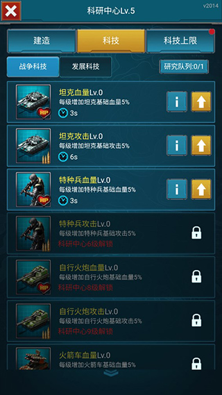 玩家点击屏幕左边蓝色科技图标,即可进入科研中心页面,可以提升坦克、特种兵等部队的等级,增加战斗力。