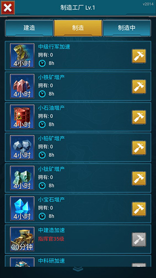 玩家点击屏幕左边蓝色制造图标,即可进入制造页面,可以进行资源的生产和制造。