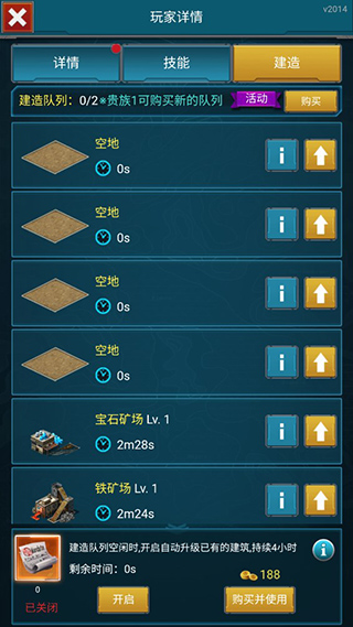 玩家点击屏幕左边蓝色建造图标,即可进入建造页面,可以查看玩家详情以及建造建筑。