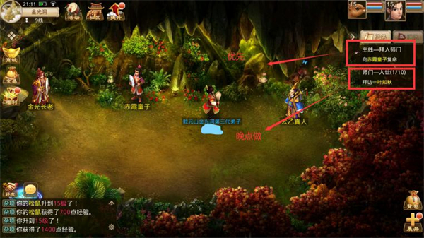 当等级达到15级后,会开启师门任务。此时按照前面提到的,可以优先选择做主线任务。因为主线任务和部分剧情的经验奖励是固定的,而师门任务等统称为日常任务的活动的奖励可以通过升级而提升。