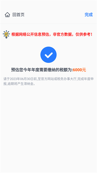 4、计算完成之后,会显示个税助理App预估您今年年度需要纳税的税额,以帮助您做出判断和制定税务计划。