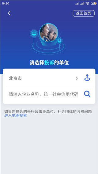 3、登录账号后点击我要投诉,可以点击定位你所在的城市或输入企业名称社会信用代码
